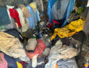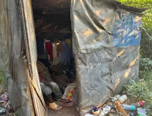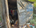 wackligen Verschlag aus Plastikplanen und Holz – ohne
